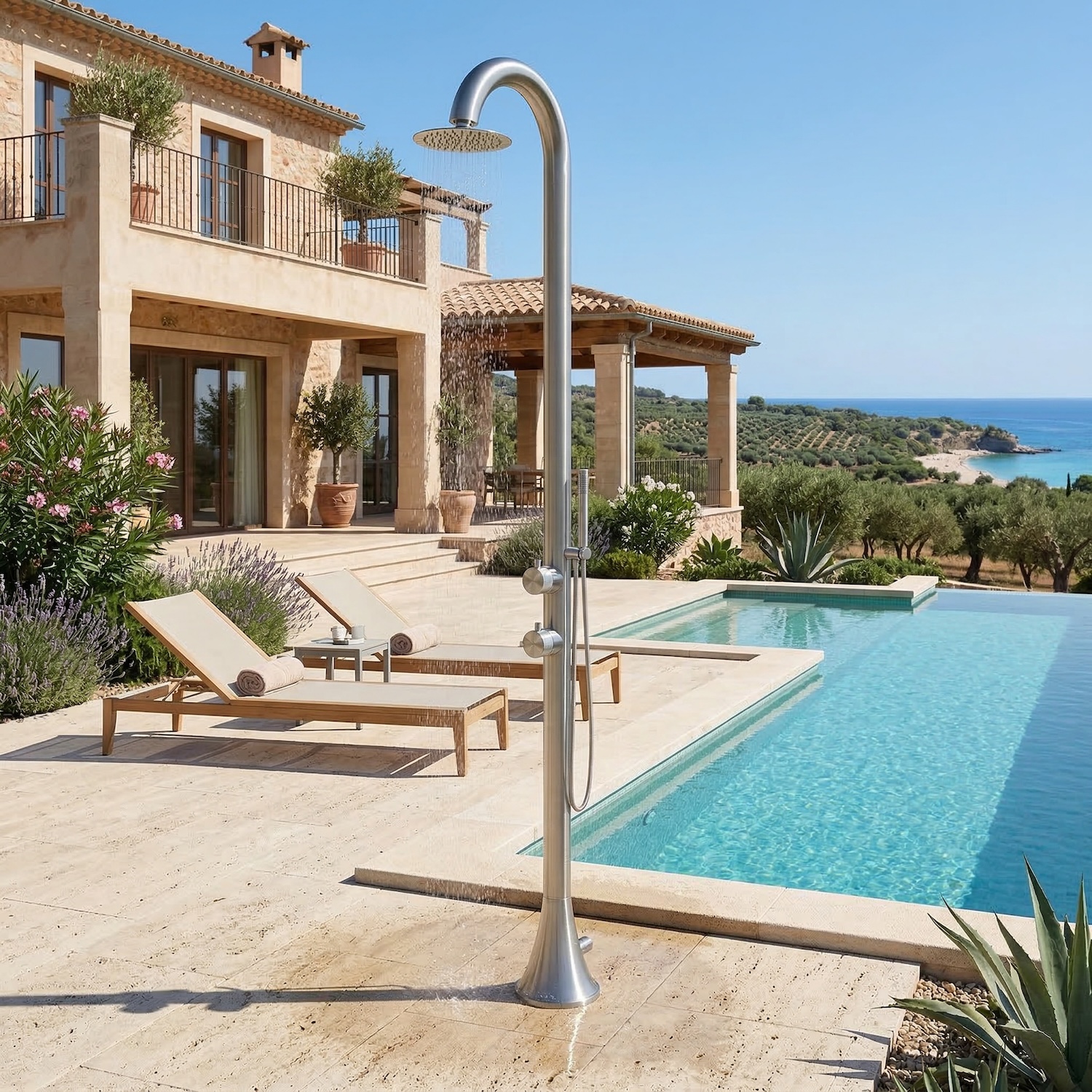 Uno degli aspetti più importanti delle docce per piscina è la loro capacità di resistere alle condizioni esterne. Le docce in acciaio inossidabile (inox) sono apprezzate proprio per la loro resistenza alla corrosione, soprattutto quando esposte all’acqua e agli agenti atmosferici. L’acciaio inox è altamente resistente alla ruggine, un fattore cruciale nelle zone umide come le piscine, dove l’umidità costante può rapidamente deteriorare materiali meno robusti.