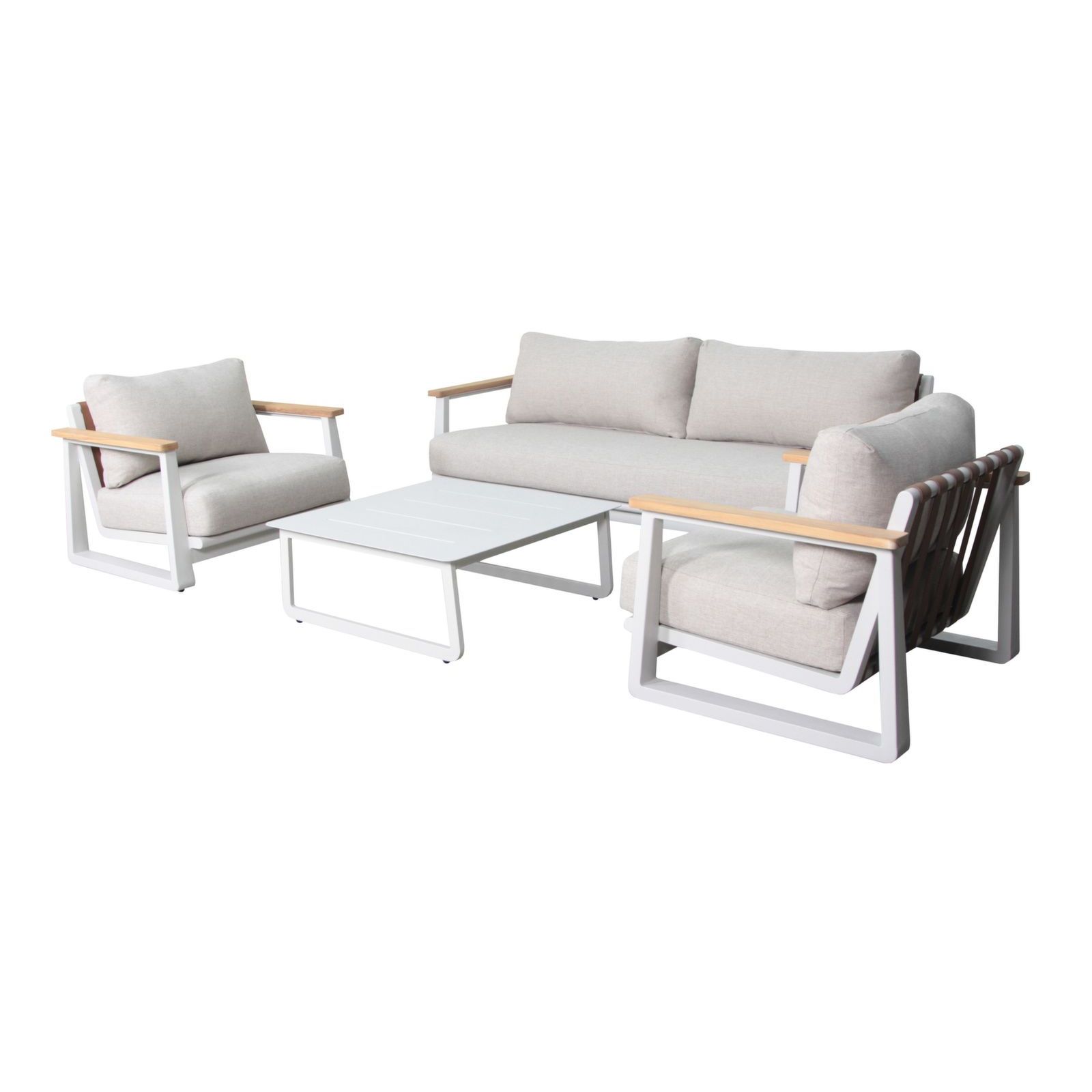 SINED Set salotto giardino BRA completo: divano modulare 3 posti, 2 poltrone, elemento angolare e tavolino basso. Struttura in alluminio con braccioli in teak FSC®, cuscini imbottiti sfoderabili e idrorepellenti. Comfort durevole ed eleganza per esterni.
