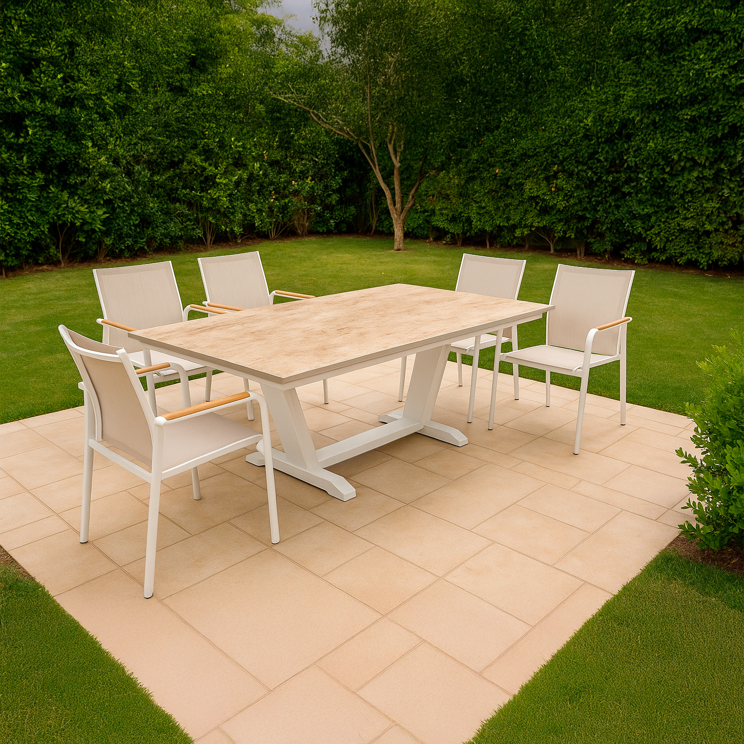 SINED Tavolo da giardino allungabile 180–280 cm praline con piano in ceramica Kedra e struttura in alluminio verniciato. Elegante, resistente e facile da mantenere, ospita fino a 10-12 persone. Perfetto per pranzi conviviali in giardino o terrazza.