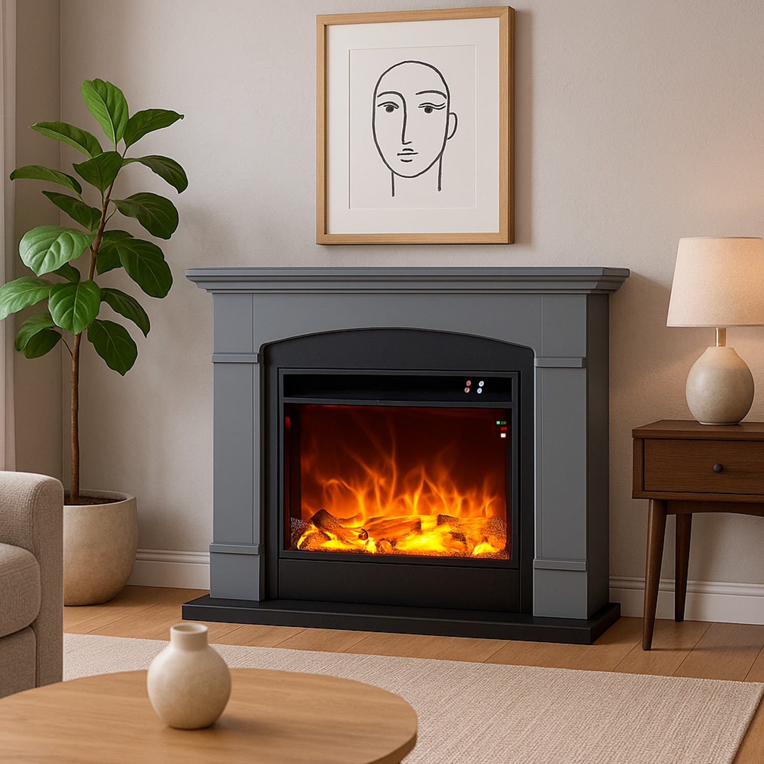 Caminetto elettrico da pavimento per tutte le stagioni, per uso domestico o commerciale. La mensola del camino elettrico presenta una finitura grigio scuro multistrato, nonché un delicato centro ad arco, colonne lisce e un telaio centrale con bordi arrotondati. La luce integrata a Led è molto realistica. La profondità di soli 25 cm lo rende poco ingombrante, perfetto per qualsiasi ambiente.