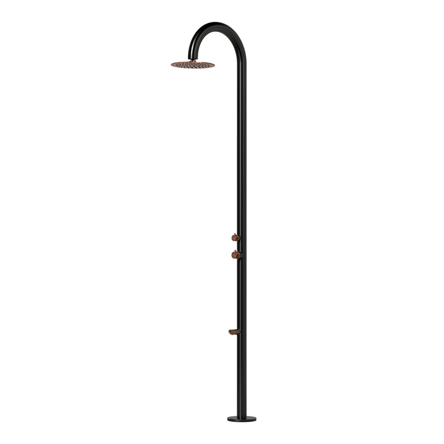 Doccia inox di colore nero per esterno di alta qualita. La doccia con doccino modello CHIA è una doccia in Acciaio Satinato Aisi Inox 316L con ingresso acqua calda e fredda. La doccia per esterno con acqua calda e fredda, è ottima per uso commerciale, privato, per piscina esterna-interna, giardino. per il bagno di casa, SPA o stazione termale.