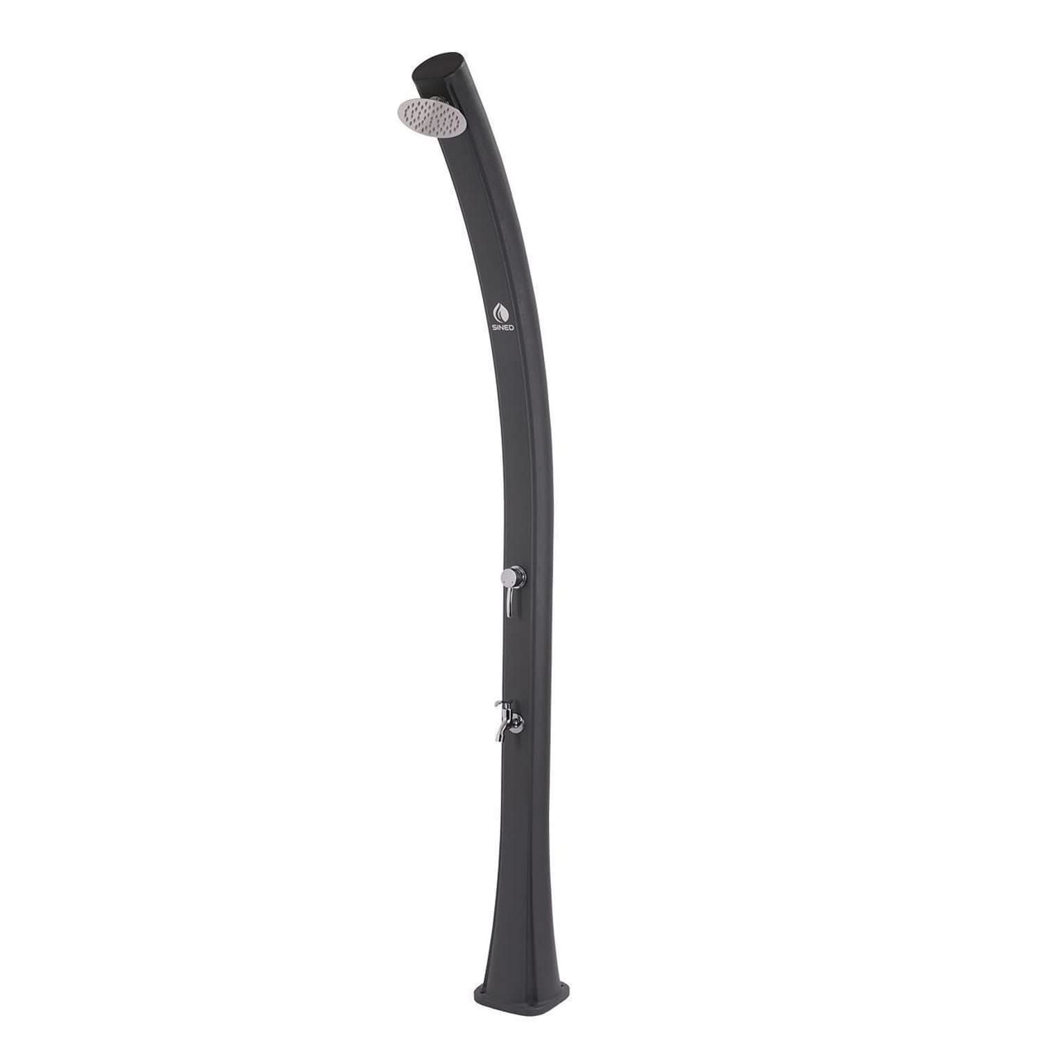 SINED Doccia Blu a Riscaldamento Solare Per Piscina Con Struttura Curva In Polietilene Hd. Altezza 226 Cm Soffione Rotondo Diametro 15.24 Cm Serbatoio 25 Litri Rubinetto Lavapiedi Accessori In Metallo Colore Nero. Filtro Anticalcare e Copertura Per La Doccia.