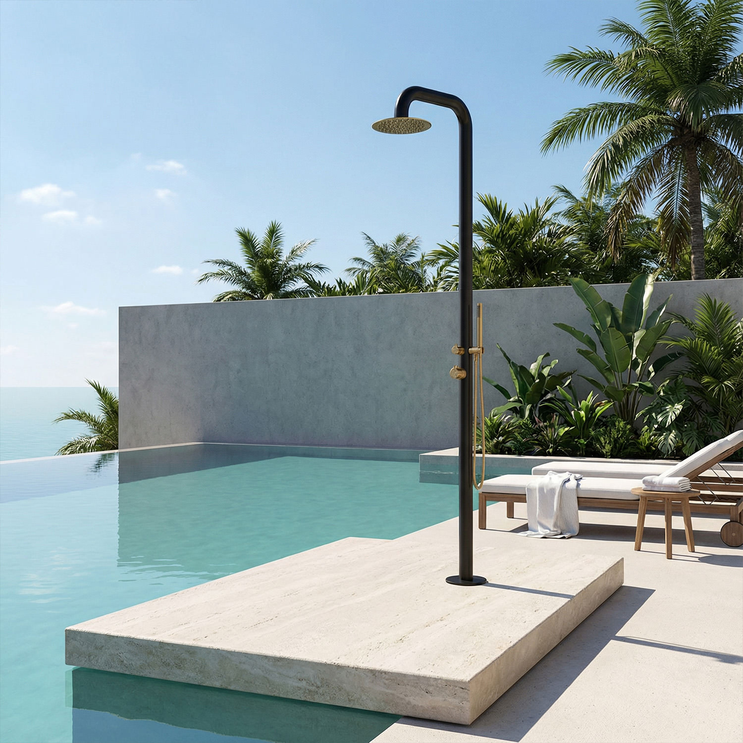 - 3-Versatilità di Installazione: Grazie al suo design sofisticato, la doccia Budoni può essere installata in una varietà di ambienti esterni, come giardini, piscine, SPA e terme. Non necessita di essere esposta direttamente ai raggi solari, offrendo così flessibilità nella scelta del luogo di installazione.