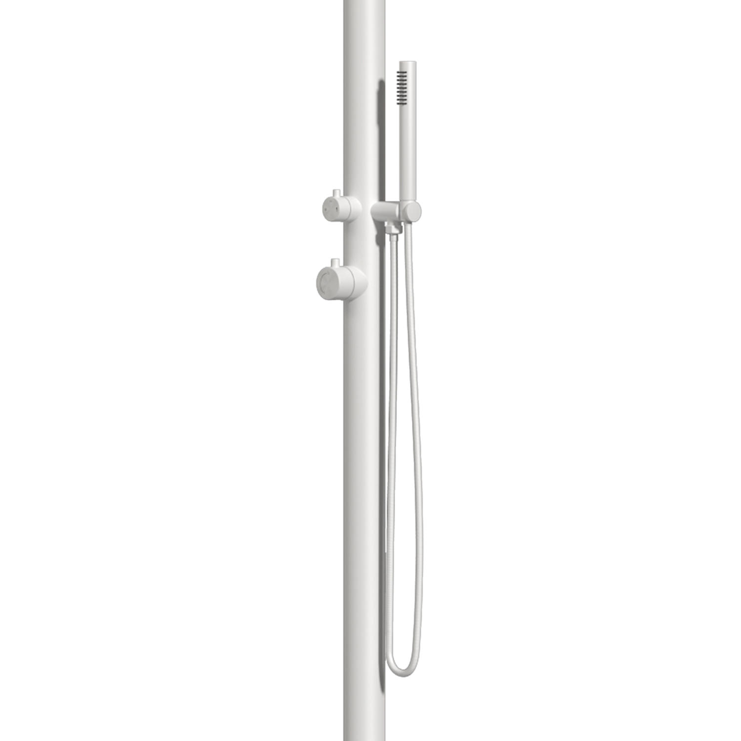SINED Doccia Esterna Bianca Chia Sined In Acciaio Inox. Miscelatore e Doccino, Struttura e Accessori In Aisi 316l. Fusto Diametro 6 Cm, Acqua Caldafredda, Attacchi Integrati, Altezza 2300 Mm. Ideale Per Esterno e Interno, Anche Per Ambienti Marini.