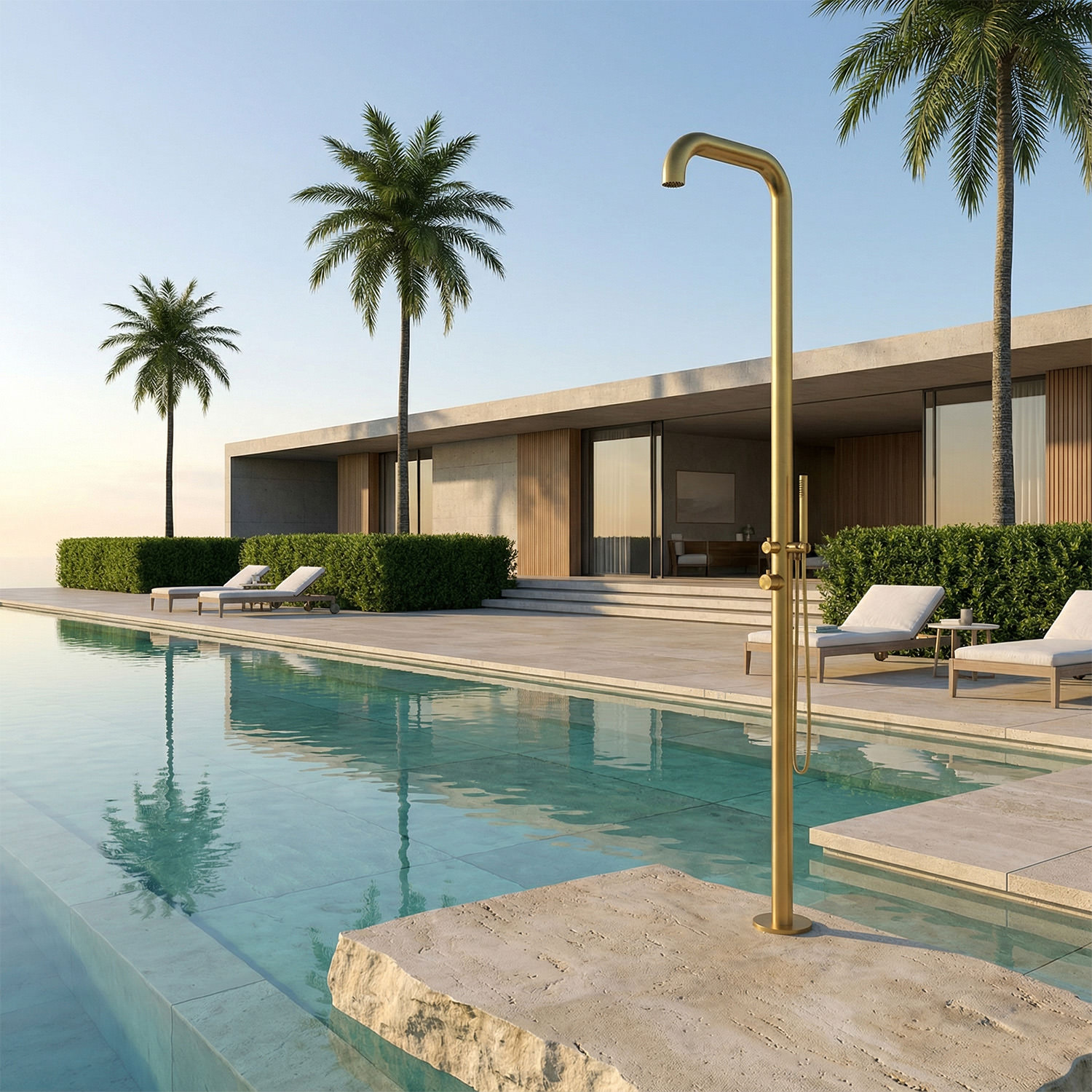 - 1-Eleganza senza tempo: Il colore oro della Doccia CHIA di SINED introduce un livello di lusso e raffinatezza senza precedenti negli spazi esterni. La finitura oro non solo aggiunge un tocco di classe ma sottolinea anche l’alta qualità del design, rendendola una scelta prediletta per ambienti esclusivi.