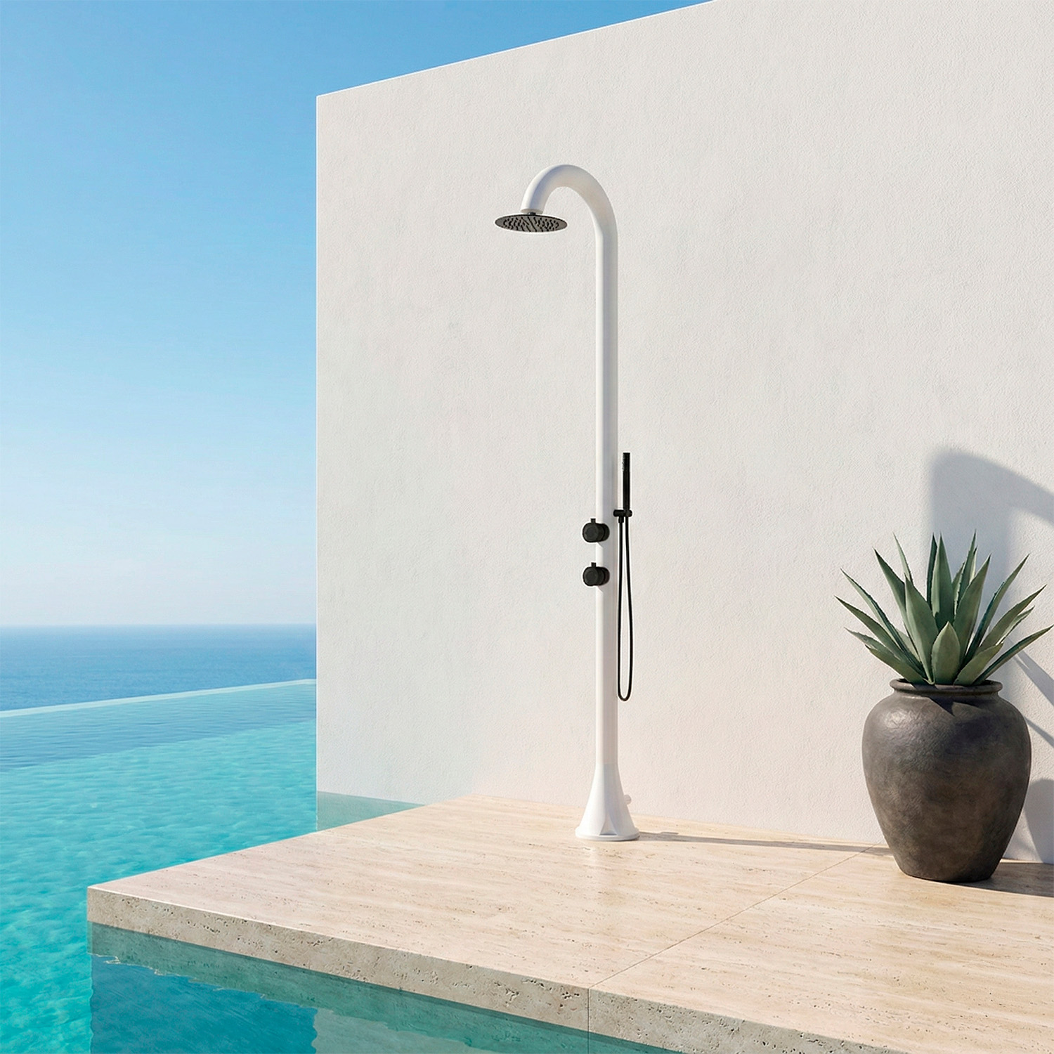 SINED è lieta di presentare la nuova doccia in acciaio inox 316L detto anche nautico, pensata e realizzata per qualsiasi installazione all’aperto. La doccia con doccino modello LUNA D INOX è una doccia in Aisi Inox 316L, dotata di ingresso acqua calda e fredda, perfetta per ambienti esterni e interni. Il design e la qualità dei materiali utilizzati conferiscono alla doccia una resistenza superiore e un’estetica impeccabile, rendendola ideale per ambienti salini o umidi, come le terme o i giardini marittimi.