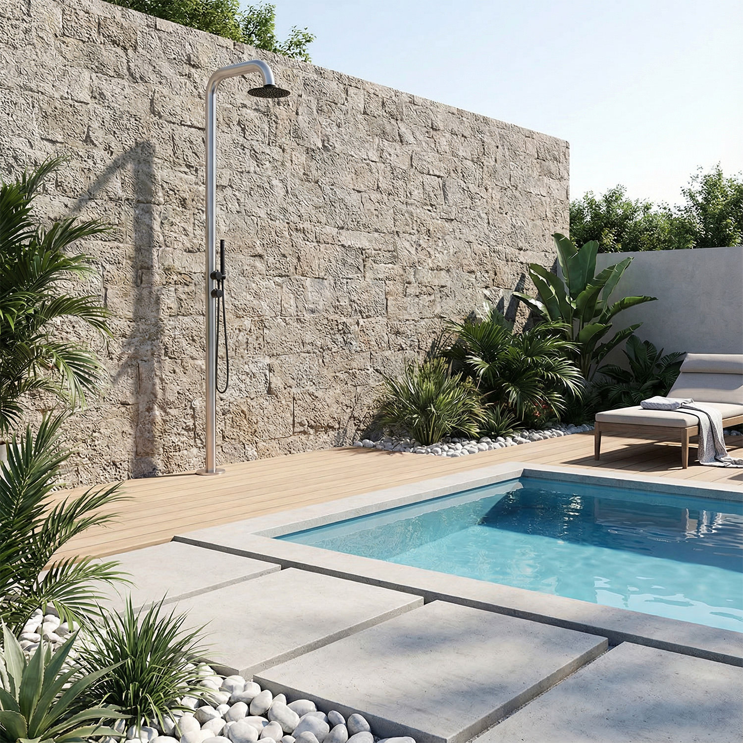 SINED Doccia Da Esterno Pula Sined Doccia Per Piscina e Giardino. Soffione Diametro 25cm Struttura e Accessori In Acciaio Inox Marino Aisi 316l Fusto Diametro 6 Cm In Doccia Con Alimentazione Acqua Calda e Fredda Miscelatore e Doccino a Mano h 230 Cm