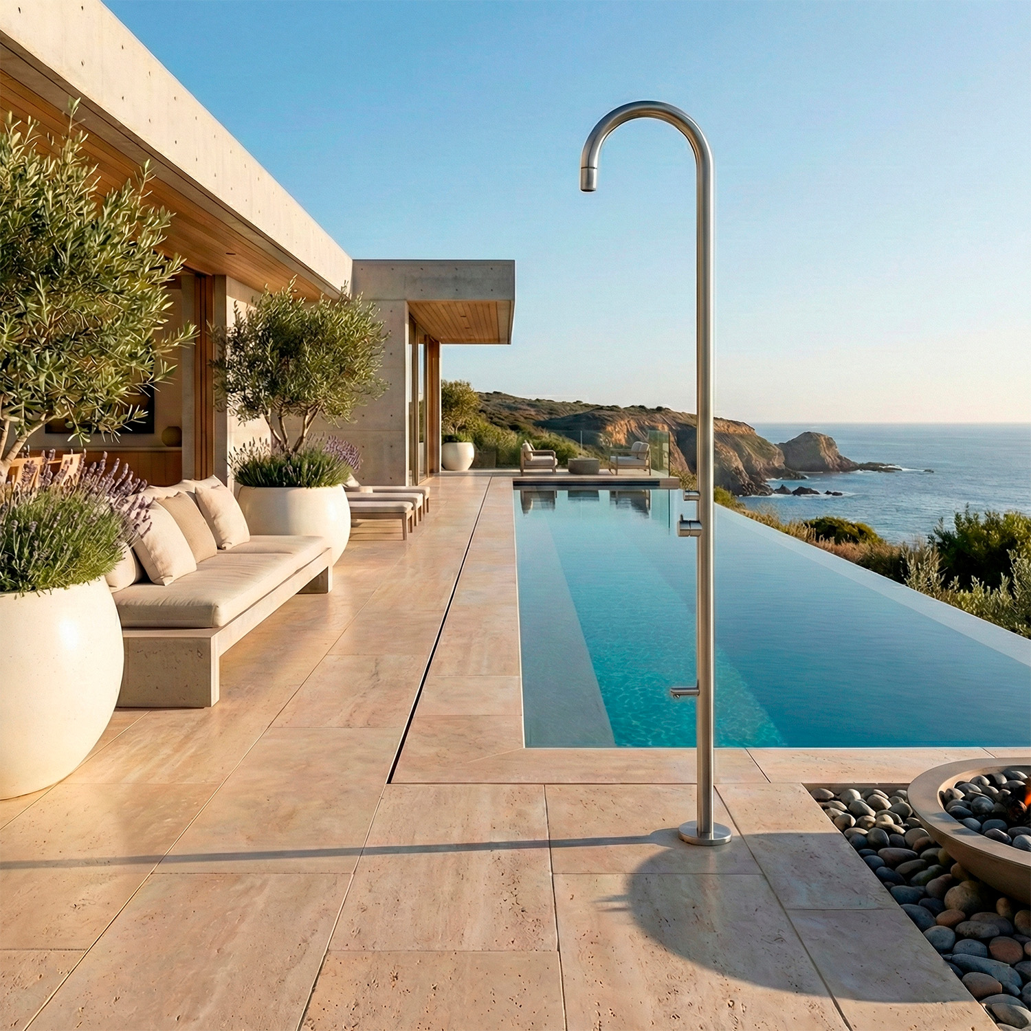 SINED doccia orosei in acciaio inox 316l satinato, elegante e resistente alla nebbia salina, garantisce durata nel tempo e ottima resistenza all’acqua calda e fredda, perfetta per chi cerca qualità e design raffinato in un prodotto durevole e affidabile.