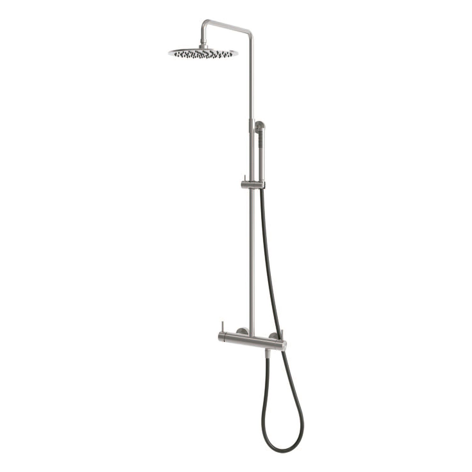 SINED Doccia da Parete Inox Satinato in Acciaio 316L adatta per interno ed esterno con ingresso acqua calda e fredda doppio miscelatore e soffione da 25 cm – Modello Levante