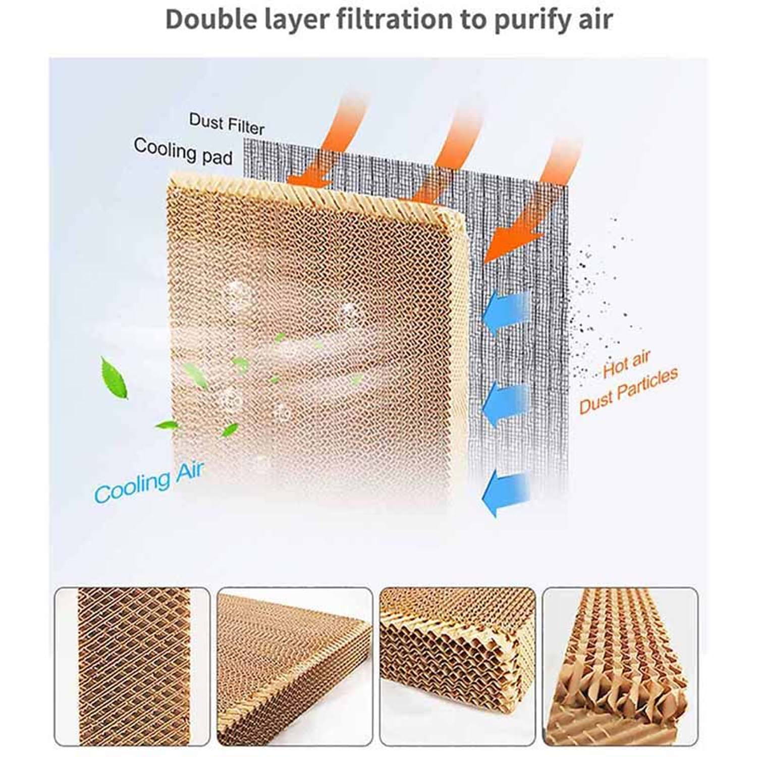 Quando il vento soffia sul corpo sudato si percepisce una piacevole sensazione di fresco, in quanto l’acqua evaporando sottrae calore. Basandosi su questo principio un raffrescatore evaporativo immette molecole d’acqua nell’aria che, evaporando al contatto con l’aria, sottraggono calore riducendo la temperatura ambiente fino a 5-12 gradi. Prima di essere nebulizzata dalla ventola l’acqua contenuta nel serbatoio dell’apparecchio passa attraverso dei pannelli filtranti ed è pertanto pulita.
