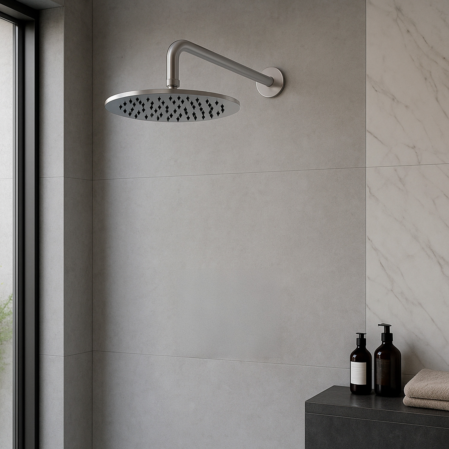 SINED Kit Braccio e Soffione Doccia da Parete SINED. Soffione da 30 cm. In Acciaio Inox 316L Finitura Inox, Ideale per Interni ed Esterni, Elegante e Resistente alla Corrosione, Perfetto per Bagni Moderni e Ambienti Outdoor